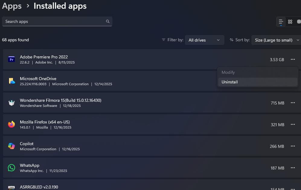 Then, after clicking on the triple dots, you will see an uninstall option; you have to click on that. You can uninstall any file or software that is installed but you no longer use. This will clean up a lot of space on your computer system.